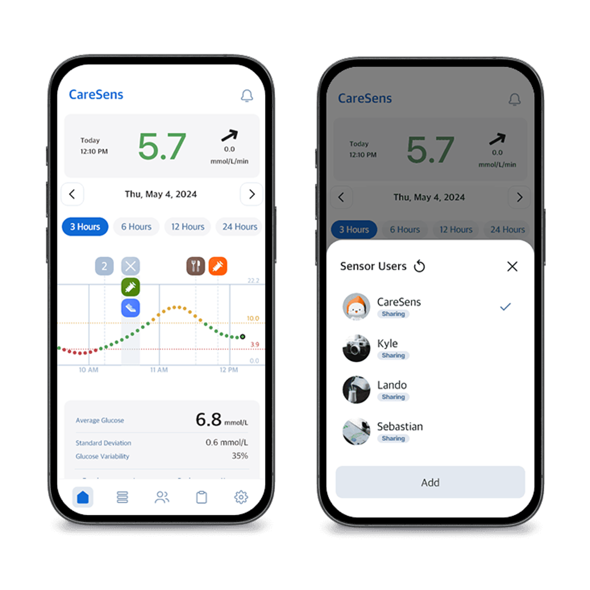 View real-time glucose graphs in Sens365, along with data from other connected sensor users in real-time.